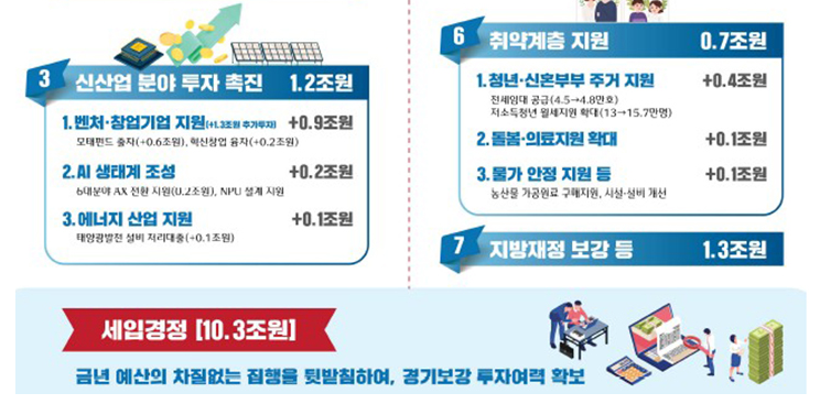 2025년 6월 19일 국무회의에서 의결된 제2회 추가경정예산(추경)안은 30조 5000억 원 규모로, 이 중 15조 2000억 원을 경기 진작에 투입합니다. 그중 10조 3000억 원은 전 국민에게 기본 15만원을 지급하고, 소득 및 계층에 따라 차등지급 방식으로 최대 50만원(15~50만원)까지 확대하는 ‘민생회복 소비쿠폰’에 활용됩니다.